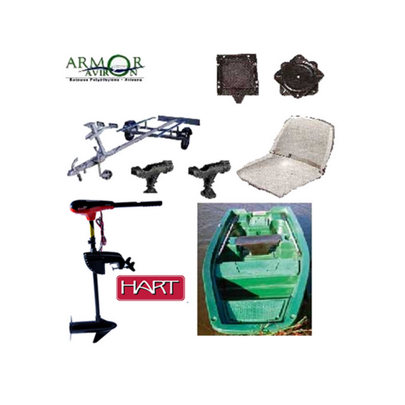 PACK ARMOR 400 BARQUE + REMORQUE + MOTEUR HART 46Lbs + SIEGE + SUPPORTS DE CANNES :