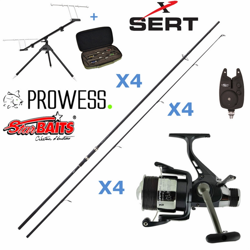 *Ce PACK CARPE CARBONE DEBRAYABLE MEDIUM INSTINCT 4 Cannes se compose de 4 cannes SERT Instinct Carp 3M60 3Lbs, de 4 moulinets débrayables PROWESS Scorpium 6001 FD, de 4 détecteurs bleus Carp Spirit Classic, d'un ROD POD Basic 3/4 Cannes Classic Maxi, d'une épuisette de même marque et d'un Coffret 4 swingers lumineux.